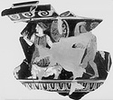 Description:   Parts of the walls and rim preserved, making up to six fragments. Nothing remains of the base. Flaring lower wall, forming an angle with the slightly concave upper wall; projecting rim, its vertical outer face in two degrees, the upper projecting above the rim, the lower overhanging. Wavy pattern on underside of rim; egg and dot around upper part of lower wall. The scene, dancing youths and girls, probably satyrs and maenads, seems to run right around the pot; what remains is more than enough for one side. There are no traces of handles.