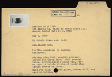 | Description: | Profile complete; no handles preserved. Flaring ring foot, roughly grooved around its upper part. Wall rounded below, vertical above; plain rim, flat on top. A triple circle of rouletting around center of floor. Hard red clay; red glaze, rather dull, except on bottom. | |