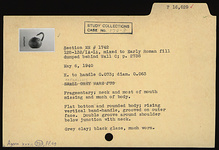 | Description: | Fragmentary; neck and most of mouth missing and much of body. Flat bottom and rounded body; rising vertical band handle, grooved on outer face. Double groove around shoulder below junction with neck. Gray clay; black glaze, much worn. | |