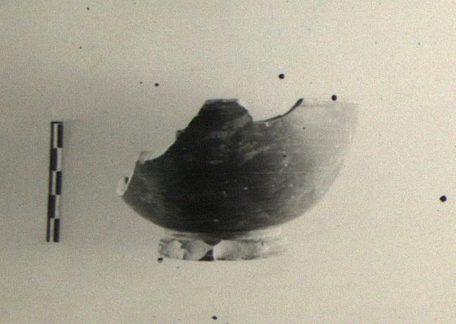 | Description: | Profile complete; about three-quarters of rim missing, foot chipped. Moulded ring foot, convex wall; plain rim marked off by a groove around the wall outside. Smooth buff clay with dull red glaze. Pergamene. | |