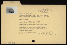 | Description: | Fragment of body of large coarse pot. Incised on interior: <graphic> Pinkish clay; light buff slip inside and out. | |