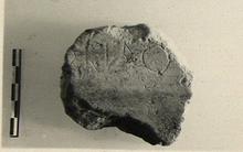 | Description: | Fragment of body of large coarse pot. Incised on interior: <graphic> Pinkish clay; light buff slip inside and out. | |