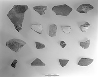 Description:   Rim fragment of nearly flat round lid, slightly convex on top. Incised decoration on outside; dots around edge, single and double dot rows between straight lines radiating from center.