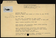 | Description: | Both broken; lid complete, small piece missing from bottom of casserole. Small round-bottomed casserole with vertical lip and interior flange to support lid; single vertical loop handle, on rim. Plain lid with small pointed knob. Coarse brown micaceous clay. Interior of casserole and part of lid blackened by fire. | |