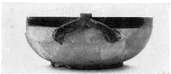 Description:   About half preserved. Wide low ring foot. Wall curves up to plain unthickened vertical lip marked with broad shallow groove on exterior. Horizontal wish-bone handles. Body inside and out, and base covered with sealing-wax red, now mostly peeled off. Lip, handle, foot and two circles (one wide and one narrow) on base glazed black.