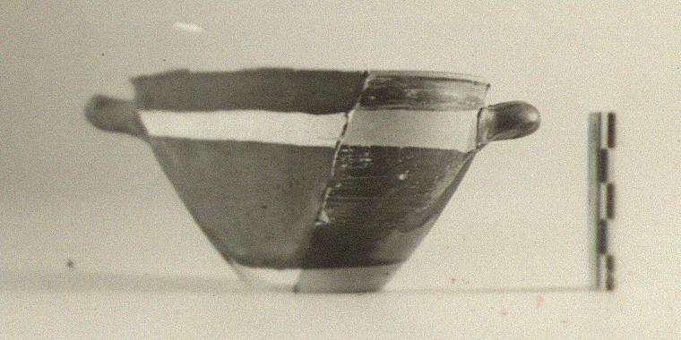 Description:   One handle and much of rim and body missing; restored in plaster. Plain, slightly projecting rim. Body tapers to small flat bottom. Reserved band at line of handles and at bottom of body. Top of rim and bottom also reserved.