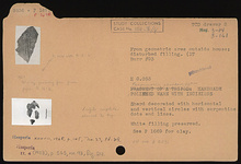 | Description: | [Originally identified as tripod fragment.] Incised decoration: horizontal and vertical circles with serpentine dots and lines. White filling preserved. Handmade polished ware. Cf. P 1669 for clay. ADDENDA Many joining fragments from pyre H 16:6 added [1967]. | |