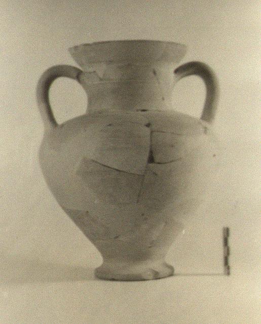 | Description: | Fragments missing throughout; restored in plaster. Flaring lip. Wide mouth and neck. Squat egg-shaped body. Spreading foot with torus edge. Underside of foot slightly concave. Band handles. Pinkish buff clay. Light buff slip, much worn. | |