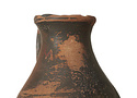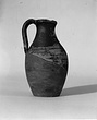 Description:   Bottom and lower part of body restored in plaster. Round mouth, rather slender body, vertical handle. On exterior, dull, rather flaky black glaze; traces of two lines in added red around body just below handle attachment.