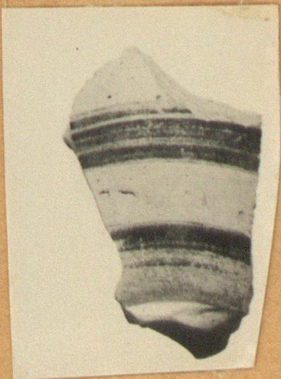 | Description: | From lower part of pointed aryballos. Decorated with red bands. Protocorinthian. | |