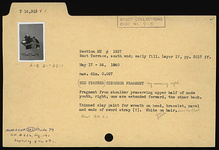 | Description: | Fragment from shoulder preserving upper half of nude youth, right, one arm extended forward, the other back. Thinned clay paint for wreath on head, bracelet, navel and ends of sword strap(?). White leaves on wreath above top of head. | |
