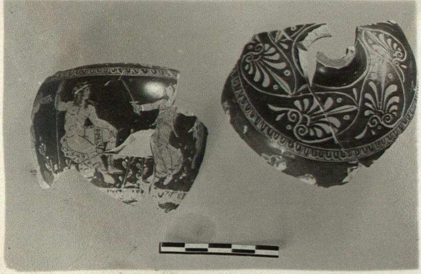 | Description: | Two non-joining fragments. a) Most of shoulder and part of upper body, made up from three pieces. Heads of two women right, the front one carrying a large bowl with handle, uncertain object at edge of break. b) Bit of the shoulder and a large part of one side of the body, made up of three pieces. Parts of three figures, from left: front part, head missing, of draped figure, right; seated nude male, with boots and staff, right; dancing maenad, left, draped, sword in one hand, dead animal in the other. Palmette pattern on shoulder and border of egg pattern at its base. Ground line of egg pattern. | |