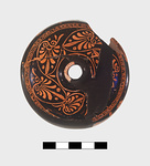 | Description: | Two non-joining fragments. a) Most of shoulder and part of upper body, made up from three pieces. Heads of two women right, the front one carrying a large bowl with handle, uncertain object at edge of break. b) Bit of the shoulder and a large part of one side of the body, made up of three pieces. Parts of three figures, from left: front part, head missing, of draped figure, right; seated nude male, with boots and staff, right; dancing maenad, left, draped, sword in one hand, dead animal in the other. Palmette pattern on shoulder and border of egg pattern at its base. Ground line of egg pattern. | |