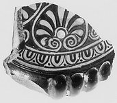 | Description: | Three non-joining fragments of an egg-shaped vase, an aryballos. a) Part of lower body and of bottom. b) Part of shoulder and of ribbing on body. c) Ribbed fragment from body. The body is divided by three vertical ribbed areas into three panels of which the lower parts of two are preserved. In one, a pair of feet; in the second, a pair of feet, left, facing a herm or stele. Palmettes on shoulder, with band of egg pattern around. Thinned clay paint for dots in palmettes and for star on bottom. Very glossy black glaze; clay and reserved red fired gray. | |