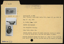| Description: | Rim fragments missing. Ring foot; plain rim. Inside glazed, except for small reserved circle at center of floor in which are a dot and two bands of glaze. Outside unglazed except for bands at edge of lip, half way down wall, foot and two circles and dot in center of bottom. | |