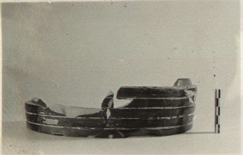 | Description: | Many joining fragments preserve a little more than half of floor, about one-quarter of the side wall and some of rim. Ring foot continuous with straight wall, which is ribbed horizontally. Rim flanged to receive lid. Good black glaze, except for inside face of foot, and circle in center of bottom. | |