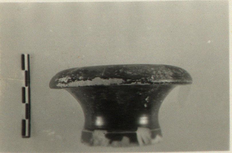 | Description: | Intact save for minor chips at base. Thick slightly projecting base; flaring side wall with thick rim convex on top. Good black glaze over all except resting surface. | |