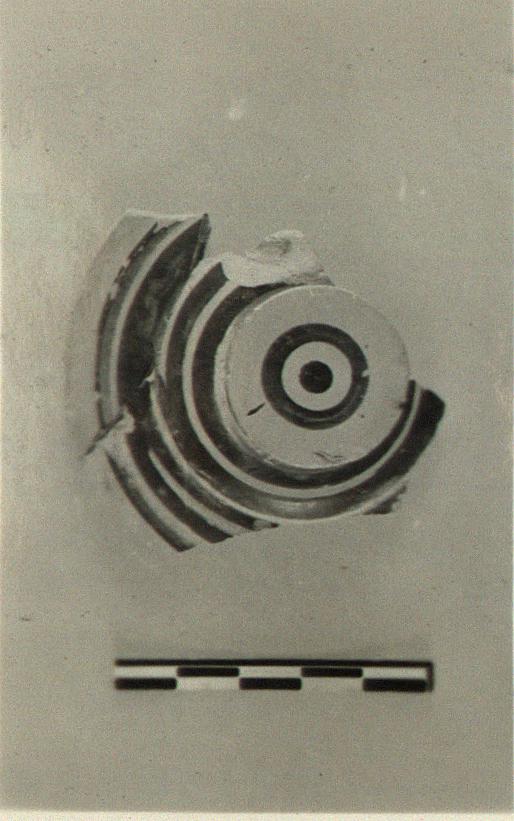 | Description: | Two joining pieces preserve handle and about one-quarter of circumference. Very slightly convex lid, ridged and grooved; flat topped knob handle grooved on outer face. Black glazed bands of varying width on upper face of lid and dotted circle on top of handle. | |