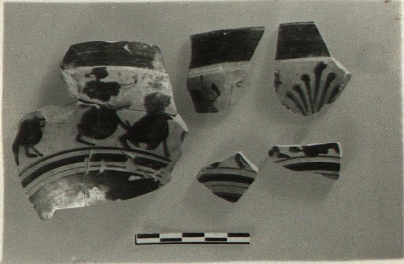 b) Rim fragment with edge of handle attachment and palmette beside.
