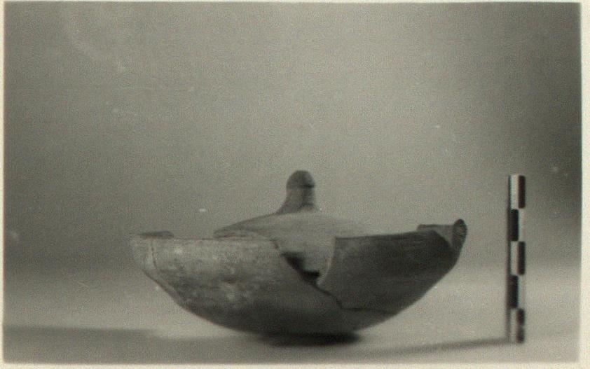 | Description: | a) Five joining fragments preserve slightly more than half of round-bottomed casserole with plain lip flanged inside. Handle missing. b) One fragment preserves less than half of low convex lid with knob handle. Household ware fabric. Unglazed. | |