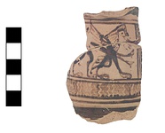 | Description: | Two joining fragments preserve part of oinochoe neck. In a reserved panel at front, a winged sphinx marching right. Face and wings drawn in outline. | |