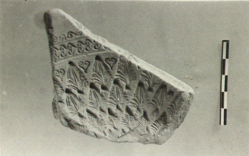 | Description: | Rim fragment. On rim: reverse spirals with guilloche below. On body: leaf pattern. Soft pinkish-buff clay; unglazed. | |
