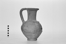 | Description: | Mended from several pieces; much of body at front missing. Ring foot; plump ovoid body; narrow high neck, round mouth with projecting undercut rim. Rolled handle. Pinkish-buff clay with brown and white grits; unglazed. | |