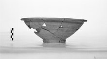 | Description: | Mended from many fragments; small fragments of wall and of rim missing. Ring foot, rather deep body; flat projecting rim; no handles. Grayish-buff clay with small white grits. | |