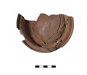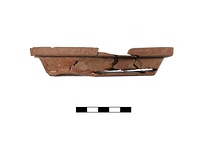 | Description: | Mended from six pieces; slightly less than half missing. Low ring foot; flat floor; outward tilted walls; projecting rim upturned at edge. Two grooves on upper face of rim; possibly traces of stamp on center of floor. Brownish clay; red glaze, much pitted and flaked. Samian? | |