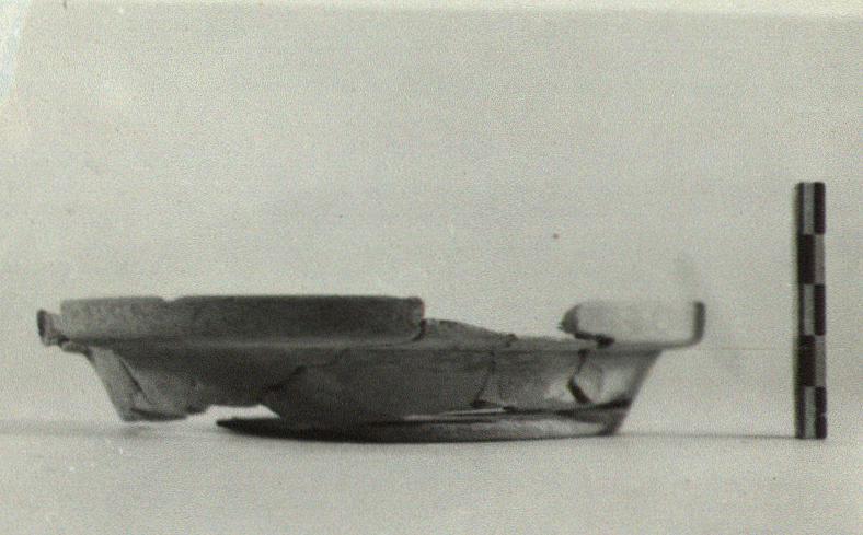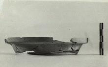 | Description: | Mended from six pieces; slightly less than half missing. Low ring foot; flat floor; outward tilted walls; projecting rim upturned at edge. Two grooves on upper face of rim; possibly traces of stamp on center of floor. Brownish clay; red glaze, much pitted and flaked. Samian? | |