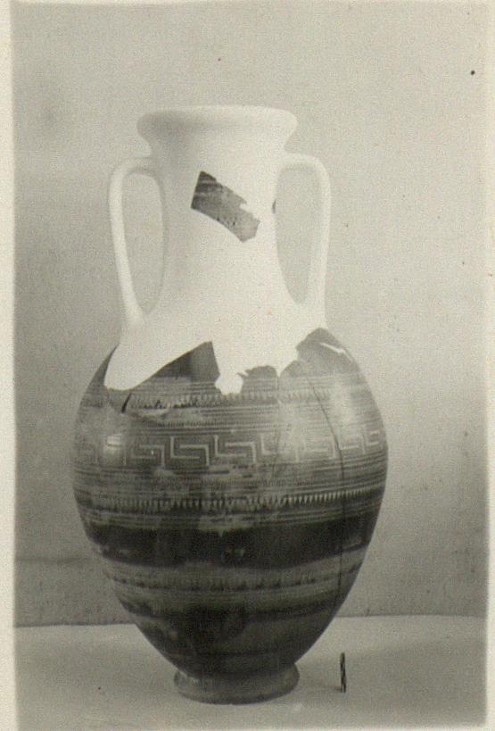 | Description: | Both handles, most of neck and rim missing; restored in plaster. Flaring ring foot; ovoid body, slightly concave neck, rounded lip. At point of greatest diameter a zone of maeander, flanked above and below by triple bands, zigzag, bands, tooth pattern and more bands. Half way between this zone and foot, a zone of tooth pattern with double bands above and below. The rest of body and foot solidly glazed. On neck, reserved panels front and back, containing: maeander, with bands above and below, and zones with alternating standing and hanging teeth with dots between. Reserved band at lip, decorated with vertical lines interrupted by butterflies. Pinkish-buff clay; good black glaze, in places somewhat metallic and peeled. | |
