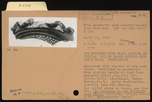 | Description: | Rim fragment from small amphora or hydria. Relief snake covered with white dots. Decorated with zigzags on the neck below. Technique as geometric. From similar hydria to that from Analatos (Pfuhl (1923), fig. 79); cf. Berlin 31312, Neugebauer (1932), Vasenführer, pl. 7. Early Protoattic, possibly late 8th c. B.C. For relief snake on vases, cf. Küster (1913), Die Schlange in der griechischen Kunst und Religion, pp. 35-45, 50. Subgeometric style. | |