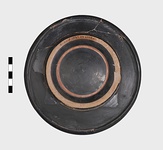 | Description: | a) Mended from three pieces, preserves floor and part of rim. b) Non-joining rim fragment. Moulded ring foot; very flat floor with shallow hollow at center; rim turned down and in; fine groove around edge of rim. Excellent black glaze over all except resting surface and groove inside foot. | |
