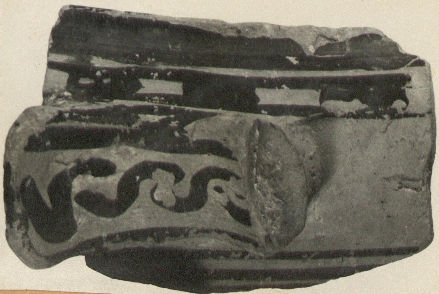 | Description: | Fragment from upper part and incurving rim. Handle with projecting ends. Decorated with bands and running dog on the handle. Paint purplish-red. Not glazed inside. The handle with tips like horns is very common at this period. Early Orientalizing(?) style. | |