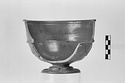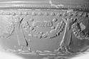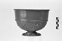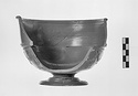 Description:   Mended from several fragments; about half of body missing. Moulded foot; short stem; shallow convex body; high straight rim with out-turned lip. In relief on body: boukrania with pendent ribbons, garlands festooned between; a band of dots above, cable pattern below. Verticals on edge of lip and on mouldings separating body from rim.