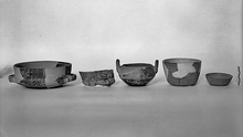 Description:   About one-third with full profile preserved; rest restored in plaster. Small, shallow, flat-bottomed bowl with upturned side walls and plain rim.