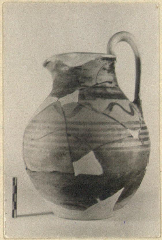 Description:   Bottom, handle and small fragments missing; restored in plaster. Rounded body with short neck, wide trefoil mouth; band handle. Glazed to point of greatest diameter, then banded; wavy line in zone at level of handle attachment; neck and mouth glazed; ladder pattern on base of handle.