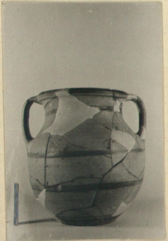 | Description: | Missing fragments restored in plaster. Similar in shape and decoration to P 17197 (ΩΔ 166), but with more rounded body and flat bottom instead of foot. ADDENDA P 17197: Ring foot; rounded body forming reverse curve with neck and plain rim; short band handles, from shoulder to rim. Glaze on foot, rim and three bands around body; wavy lines down handles. Pinkish-buff clay. Glaze black to red. | |