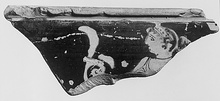 | Description: | Part of a pyxis lid with flat top, slightly projecting at edge and a straight side wall; no original edge preserved. On top, part of a chair and of draped figure seated on it, left. On side wall, head and shoulder of draped woman, left, with part of uncertain object in front of her. | |
