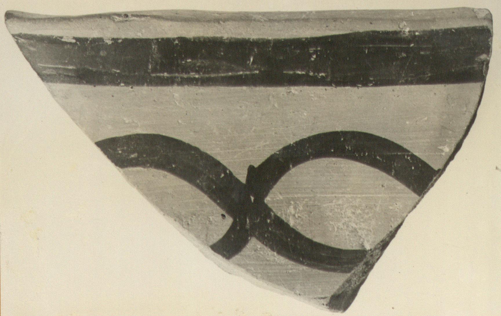 | Description: | Fragment from a large circular vessel with spout. Spout decorated with a band under the straight rim and chain pattern below. Handmade and uneven; the side is straight and then curves at one end and swells below. From a circular vessel pulled out to a spout? For the design, cf. P 1709. Early Orientalizing style. | |