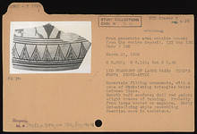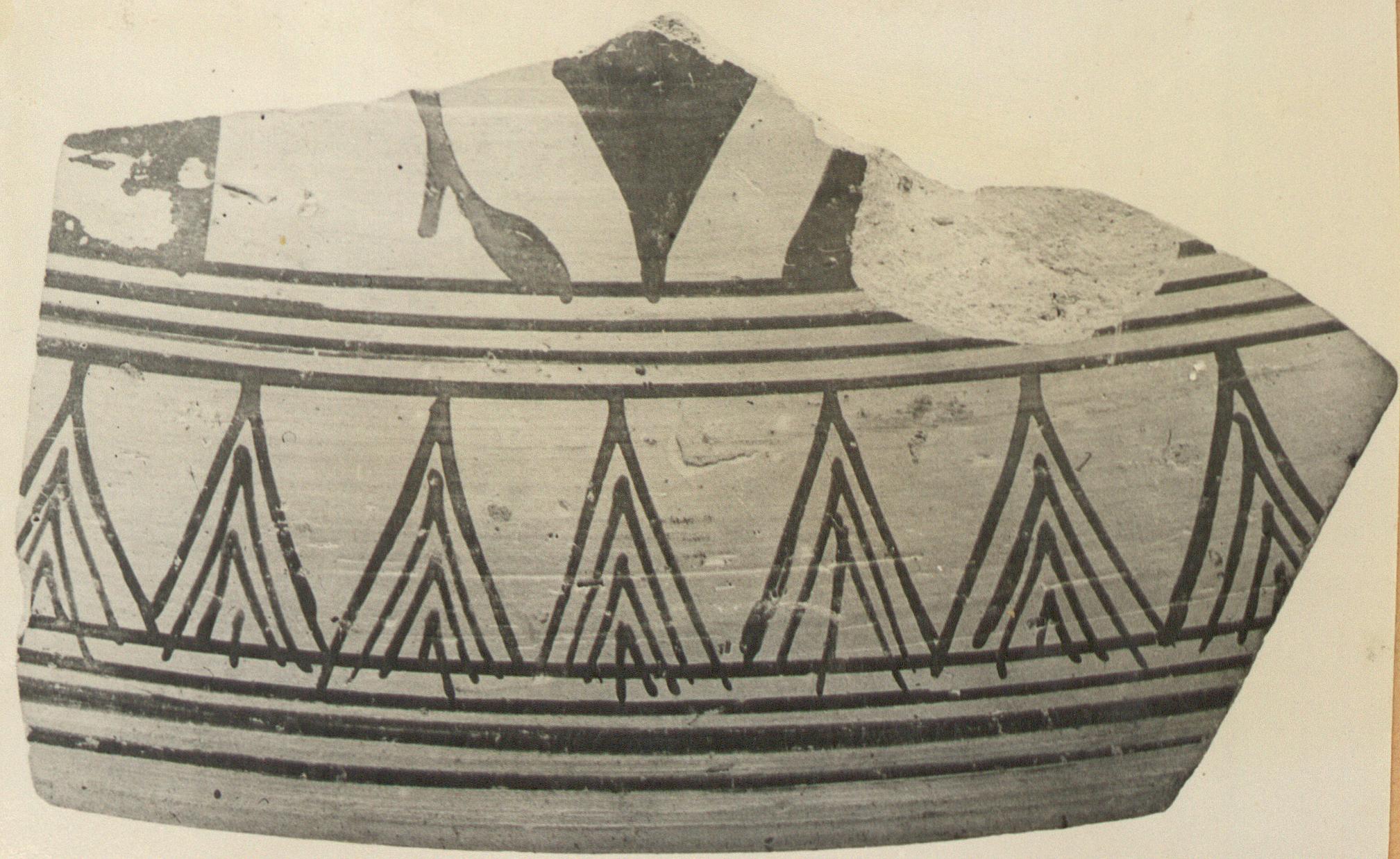 | Description: | Lid fragment of large vase. Bird's foot. Uncertain filling ornaments, with a zone of diminishing triangles below, between lines. Smooth buff surface. Dull red paint. Slight traces of burning. Probably from a large krater or amphora. Early Orientalizing style resembling Boeotian ware in technique. | |