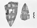 | Description: | Triangular fragment from the side wall of a closed(?) pot. Crossed vertical and horizontal bands of glaze inside and out. At one edge the glaze runs over the break, showing that it was added after the pot was broken. Buff clay. Dull red glaze. | |