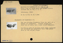| Description: | Two non-joining fragments from the wall of a kothon or plemochoe. Raised rings one near top of wall, and a pair below shoulder. Carefully made of pinkish-buff clay; unglazed but polished and decorated with tiny glaze dots on the raised rings. | |