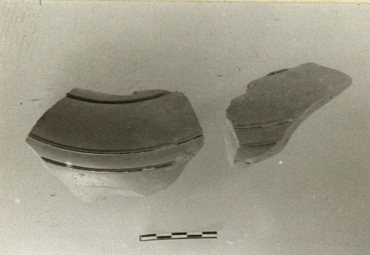 | Description: | Two non-joining fragments from the wall of a kothon or plemochoe. Raised rings one near top of wall, and a pair below shoulder. Carefully made of pinkish-buff clay; unglazed but polished and decorated with tiny glaze dots on the raised rings. | |