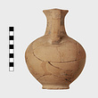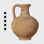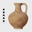 | Description: | Small fragments of body restored. Flat base and squat round body; narrow neck and round mouth drawn out to a spout in front; vertical handle. Pinkish-buff clay; the dull black glaze almost entirely peeled off. Glazed to the shoulder; then three bands at level of handle attachment; the shoulder reserved. Neck and outer face of handle glazed. Submycenaean. | |