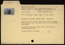 | Description: | About half the round mouth, the rolled handle rising above the rim, and part of the shoulder preserved. Incised below the neck: <graphic> Brownish micaceous clay. Dull black glaze, mostly peeled off. | |