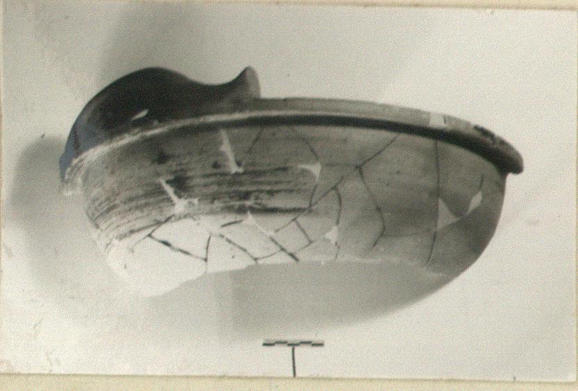 | Description: | Nearly half the upper body and flat projecting rim preserved, with the rolled lifting handle with upturned ends on top of rim. Coarse buff to greenish-buff clay. Covered inside on handle and rim and for wide band below rim outside, with dull black glaze, much peeled. Fragments of five similar louteria in tins. Cf. P 17398 (ΩΔ 382). | |