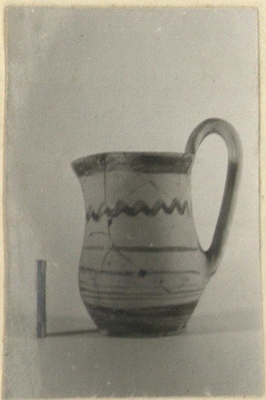 | Description: | The handle and about half the mouth restored in plaster. Low ring foot and deep convex-concave body with plain rim, pinched to make trefoil mouth. Vertical band handle. Lower body glazed; triple band below handle attachment, and band at its level; single band above, and wavy line halfway up upper body. Rim glazed inside and out. Buff clay. Dull brown glaze, somewhat peeled in places. | |