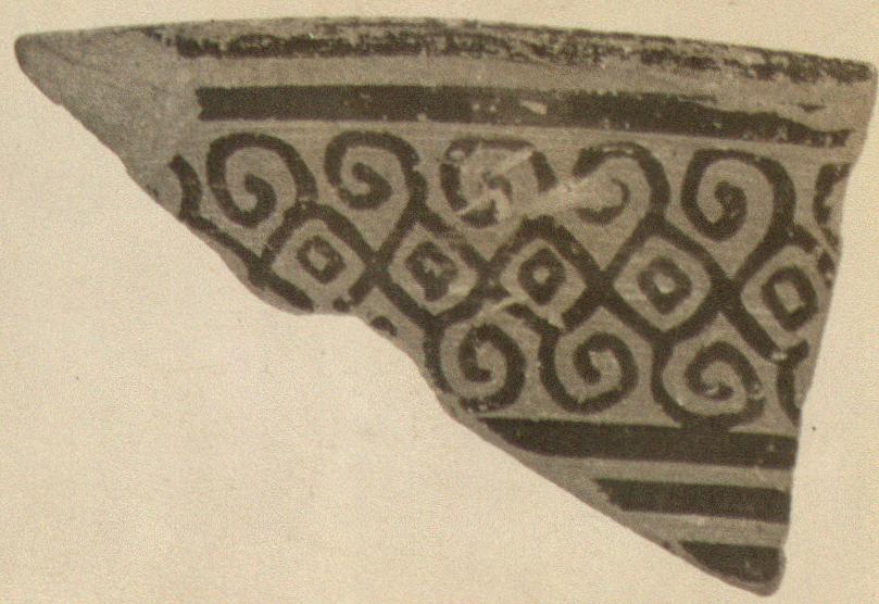 | Description: | Rim fragment from small amphora(?). Decorated with bars on the lip and a chain pattern with spiral hooks below. Red paint. Cf. CVA Pays Bas, 2, pl. 4, 3, and the Analatos hydria. Subgeometric style. | |