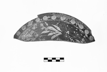 Description:   Part of the wall and rim of a shallow bowl with upturned rim; rouletting around the body below the rim. On the body outside, between two grooves below the rim, large dots of thinned clay paint alternating with double verticals of white; leaf pattern of thinned clay paint and white below.